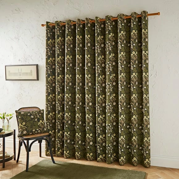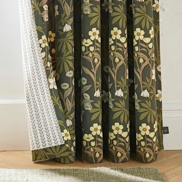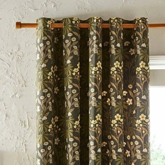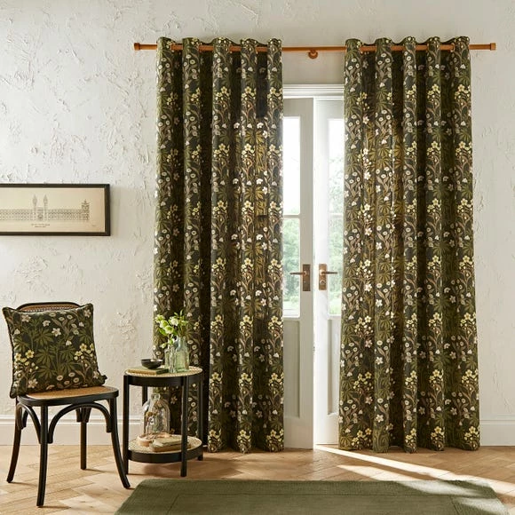 Inspired by our beautiful meadows, these curtains feature a stunning floral design that will bring a touch of nature into your home. With a rich olive colourway, these curtains will give your home interior a rich splash of colour. The pattern has been printed onto a polycotton face fabric and lined with a striped cotton rich lining. The lining will help preserve the design and front fabric from fading, making these curtains long-lasting. Complete with a durable brushed steel eyelet header, these curtains are designed for use with a curtain pole. Coordinate the curtains with the matching cushion for a stylish room look.