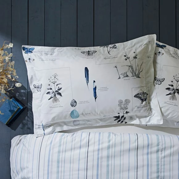A pillowcase beautifully decorated with annotated plant and animal species that can be found when exploring various UK wetland habitats. The design creates a modern scrapbook and sketchbook look curating treasured finds. Swap up the style of the bed by turning the pillowcase over to reveal a striped reverse. Durable for use after use, this pillowcase has been crafted from 100% responsibly sourced cotton. One pillowcase is included in a pack and can be fully machine washed.