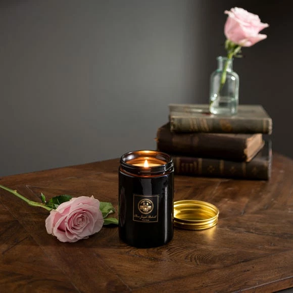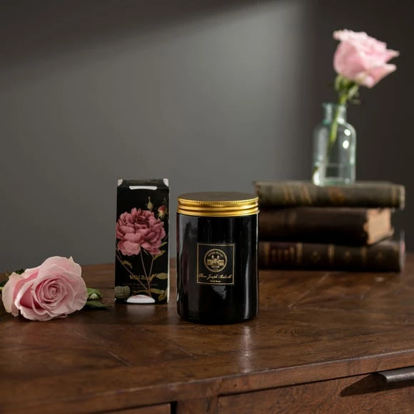 An infusion of rich rose and peony with sparkling mandarin and juicy orange facets merge with elegant notes of amber, patchouli and sensual musk. The Wild Rose Candle lasts up to 65 hours and comes in an eye-catching black candle jar with screw top gold metal lid. Keep and re-use this glass vessel once the wax has melted.